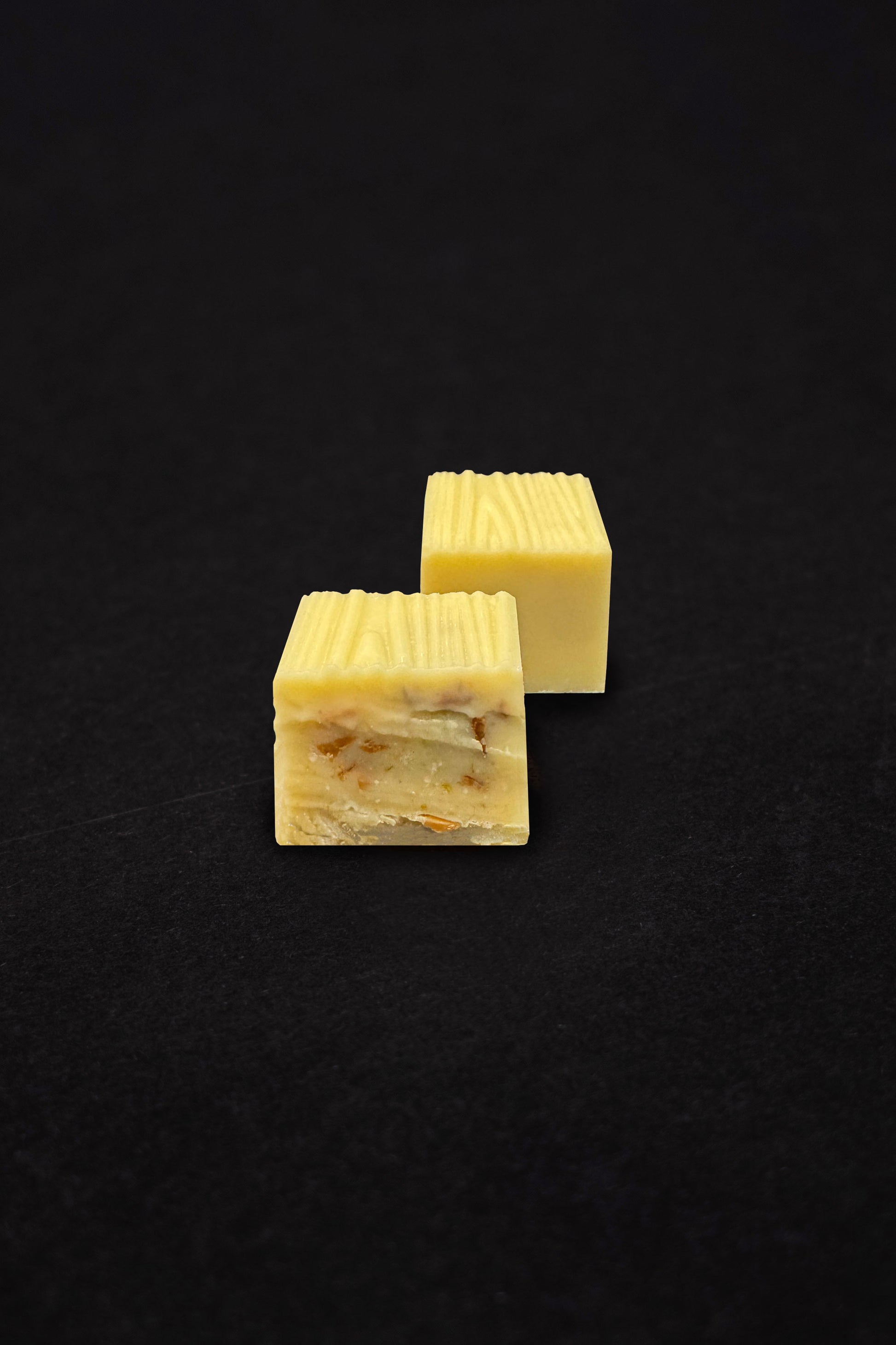 Bombón de chocolate blanco relleno de nougat de caramelo & almendras caramelizadas